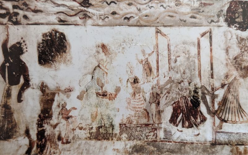 निकट दृश्य : महल के विभिन्न प्रकोष्ठों में खड़ी व बैठी स्त्रियां : राजा महल : ओरछा : सत्रहवीं सदी